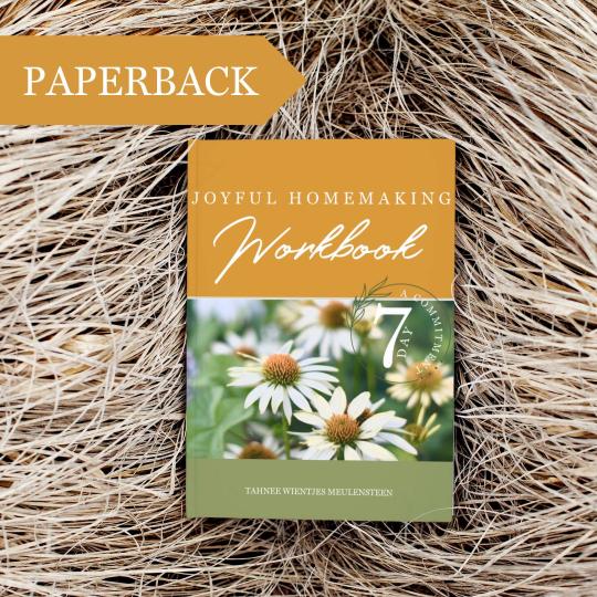 If you like to sit down with pen & paper and sip a cup of tea while you read and write… This one’s for you. This is the paperback version of the workbook “Joyful Homemaking” and will be delivered right to your door by Amazon.